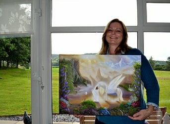 It never ceases to amaze me the delight painting can bring. My favourite medium and the only one I work with is oils. For me personally, I find their sumptuous colours, texture and depth unrivalled, also they have a forgiving nature. I was born and live in England and work from my home art studio which overlooks the beautiful Cheshire countryside. I am a intuitive painter and completely self taught having never had a single lesson. My process starts in meditation, and through my inner vision, first comes the feeling then the imagery. During the birthing of each creation I am still following and trusting my intuition, the process is very fluid as there is never a set plan.